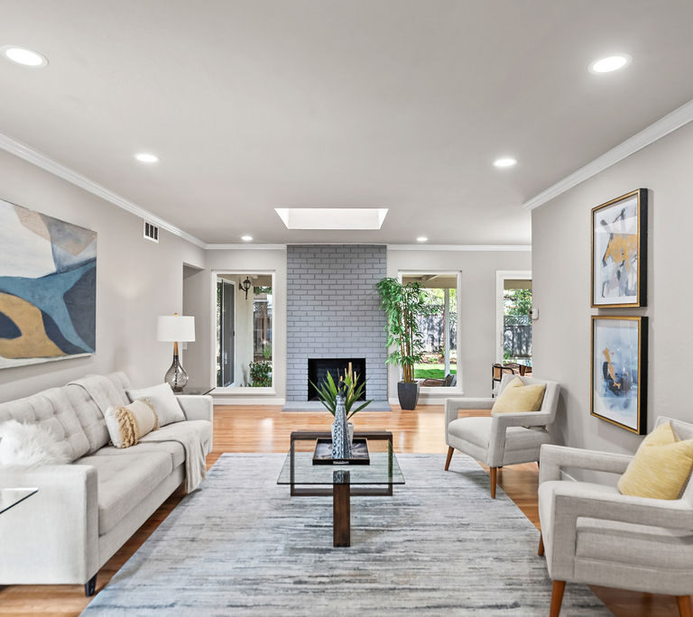 Unwind in the living room in front of a cozy brick fireplace framed by tall windows overlooking the backyard.